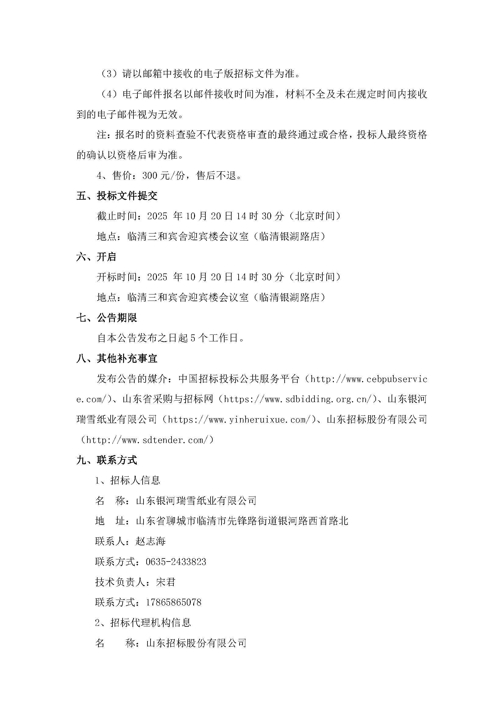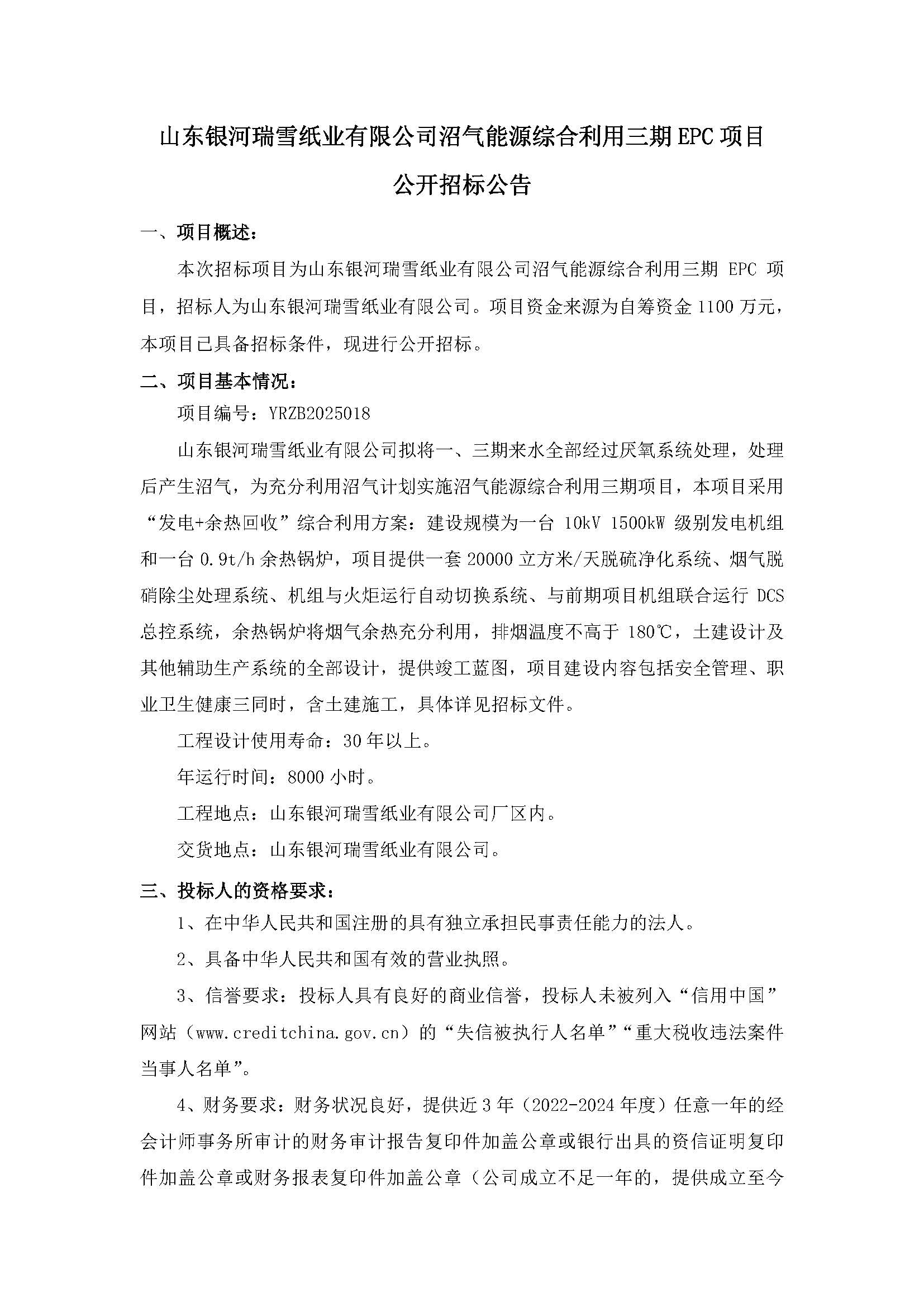 【公告 】山东银河瑞雪纸业有限公司沼气能源综合利用三期EPC项目公开招标公告
