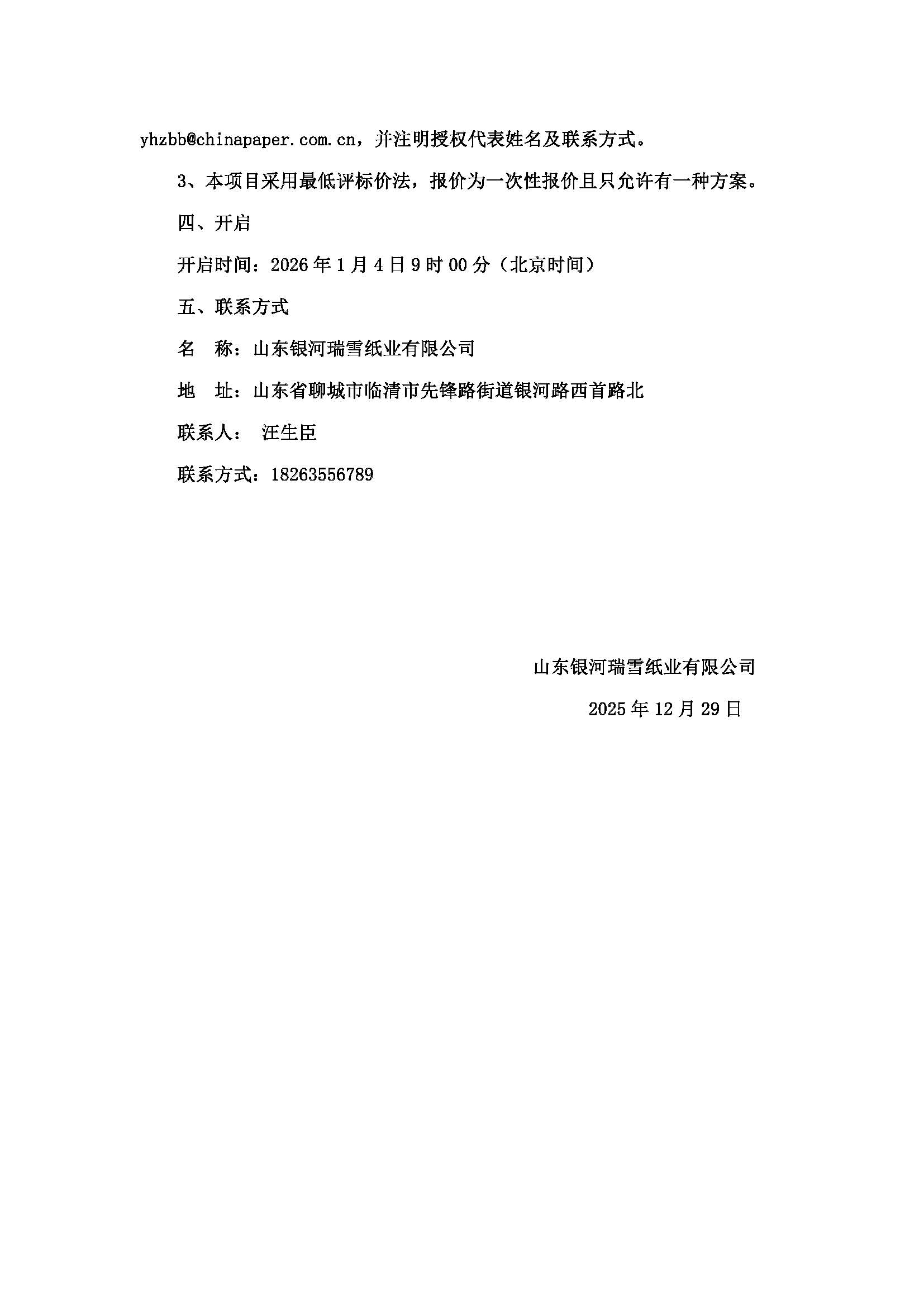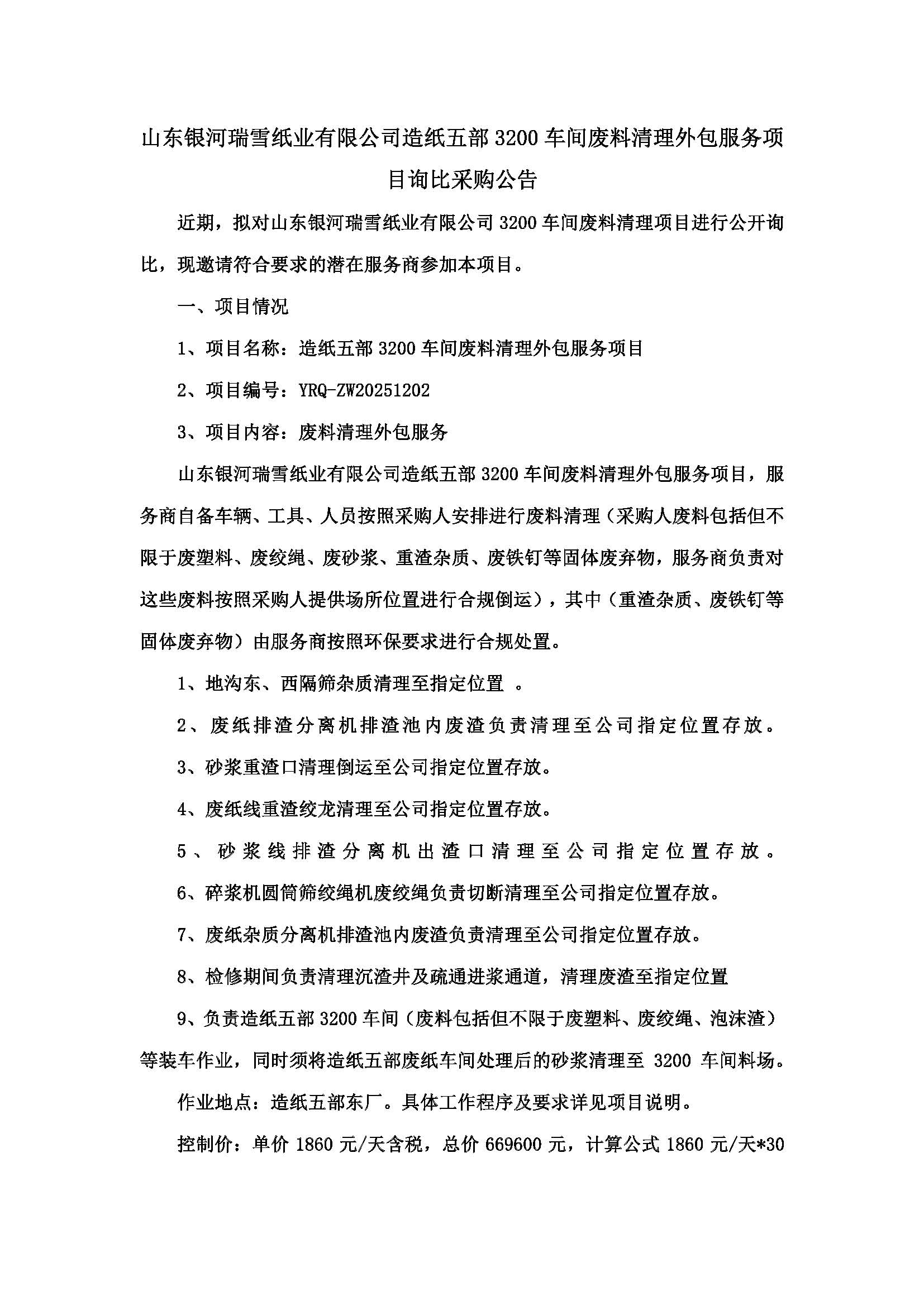 【询比】山东银河瑞雪纸业有限公司造纸五部3200车间废料清理外包服务项目询比采购公告