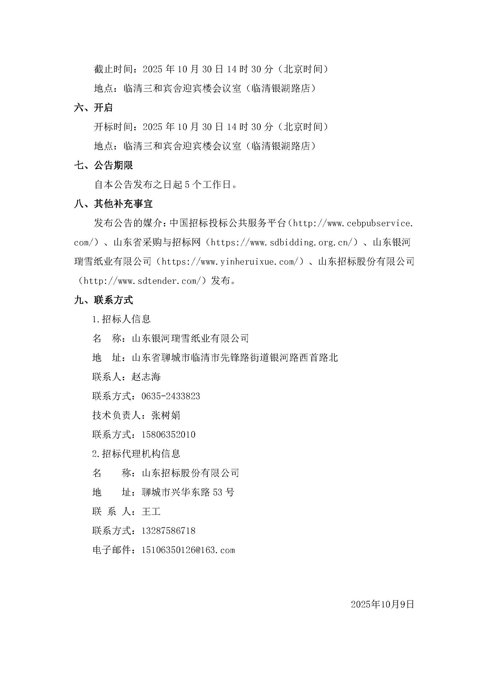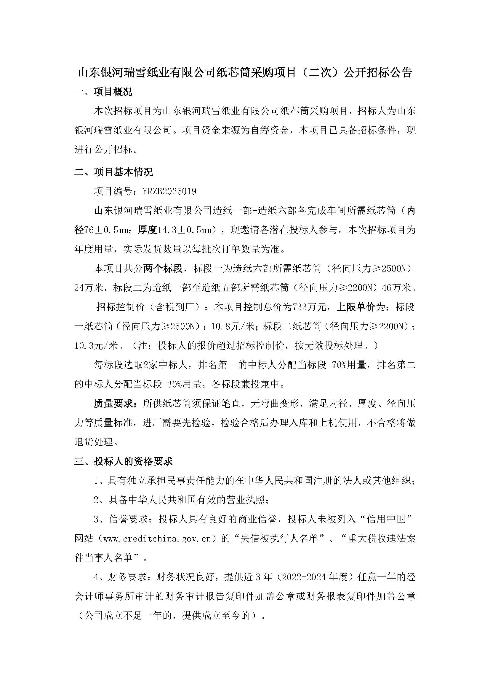 【公告】山东银河瑞雪纸业有限公司纸芯筒采购项目(二次)招标公告