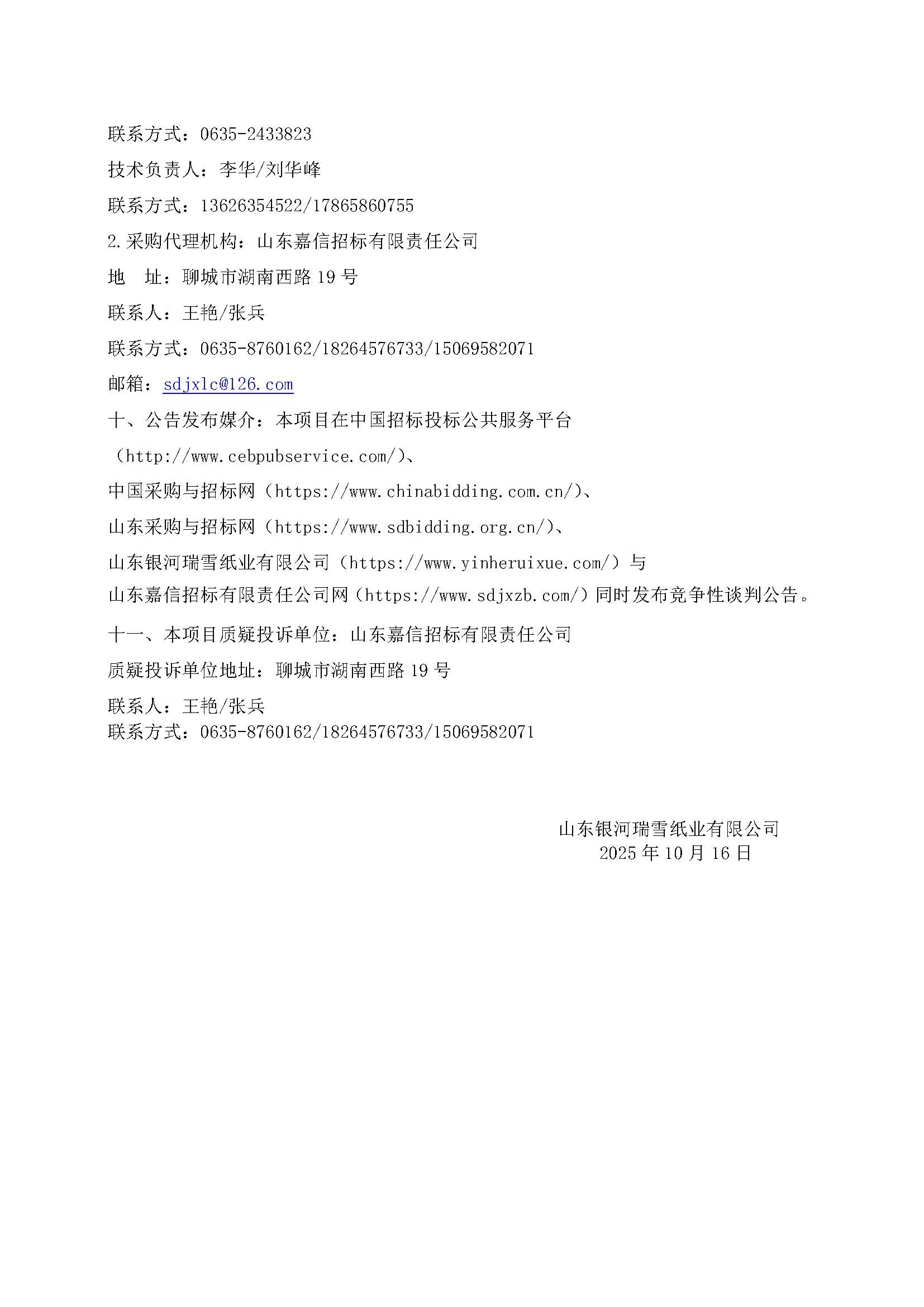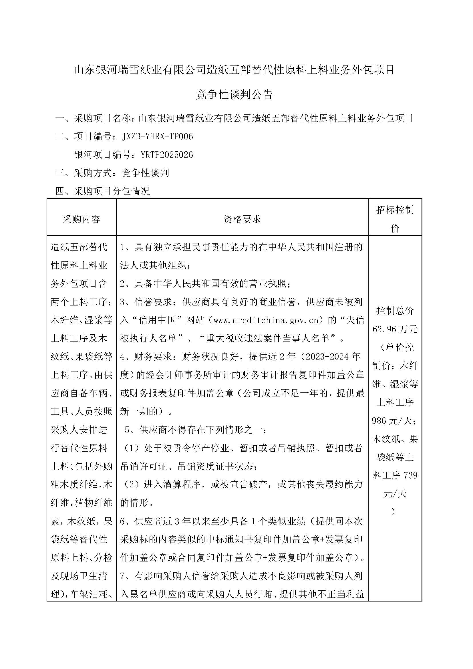 【公告】山东银河瑞雪纸业有限公司造纸五部替代性原料上料业务外包项目竞争性谈判公告
